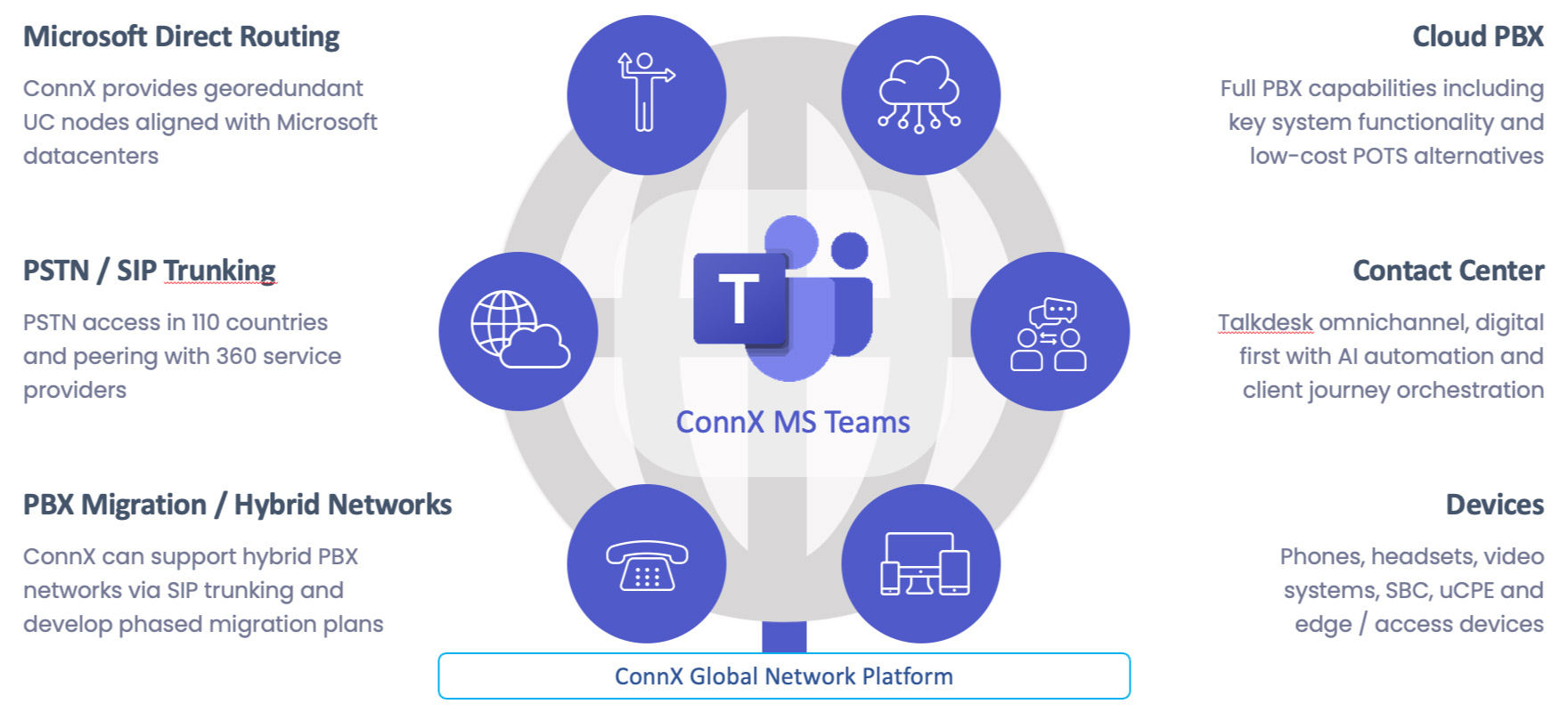 Move your organization to a secure and reliable cloud communications platform with ConnX Microsoft Teams Direct Routing, the fully-managed global solution for cloud voice and premium remote meetings.